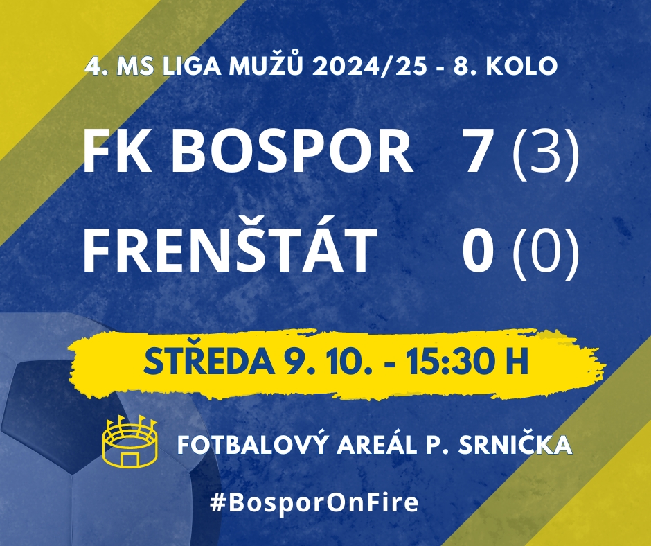 Dohrávaný zápas 8. kola Bospor zvládl bez zaváhání. Předposlední Frenštát neměl v duelu ani jedinou šanci a nakonec si odvezl sedmigólový příděl, v pěti brankách měl prsty slovenský záložník Samuel Fulier, jenž jeden gól dal a u čtyř asistoval. Bohumíňáci poskočili mezi kvarteto devatenáctibodových týmů na třetím až šestém místě, v neděli se postaví stejně úspěšnému Vratimovu.