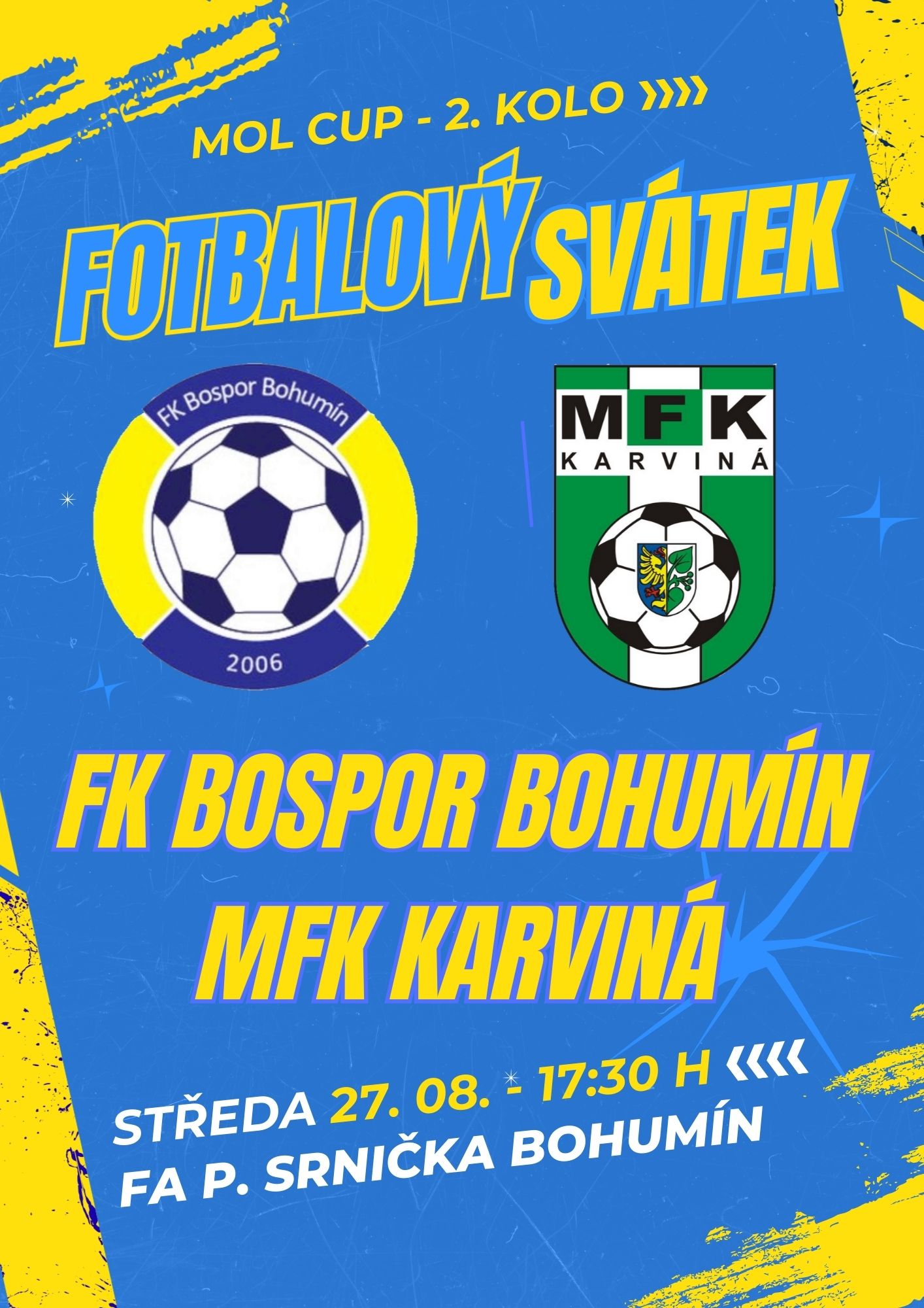 To tady ještě nebylo! Od rozdělení federace ještě nikdy v Bohumíně nehrál účastník nejvyšší české fotbalové soutěže ostrý zápas a ani žádný zdejší klub nezažil dva postupy v domácím poháru. Teď ve středu se ale historie změní. Bospor bude ve 2. kole MOL Cupu hostit MFK Karviná, aktuálně sedmý celek Chance Ligy, duel má v areálu Pavla Srnička výkop v 17:30 hodin.