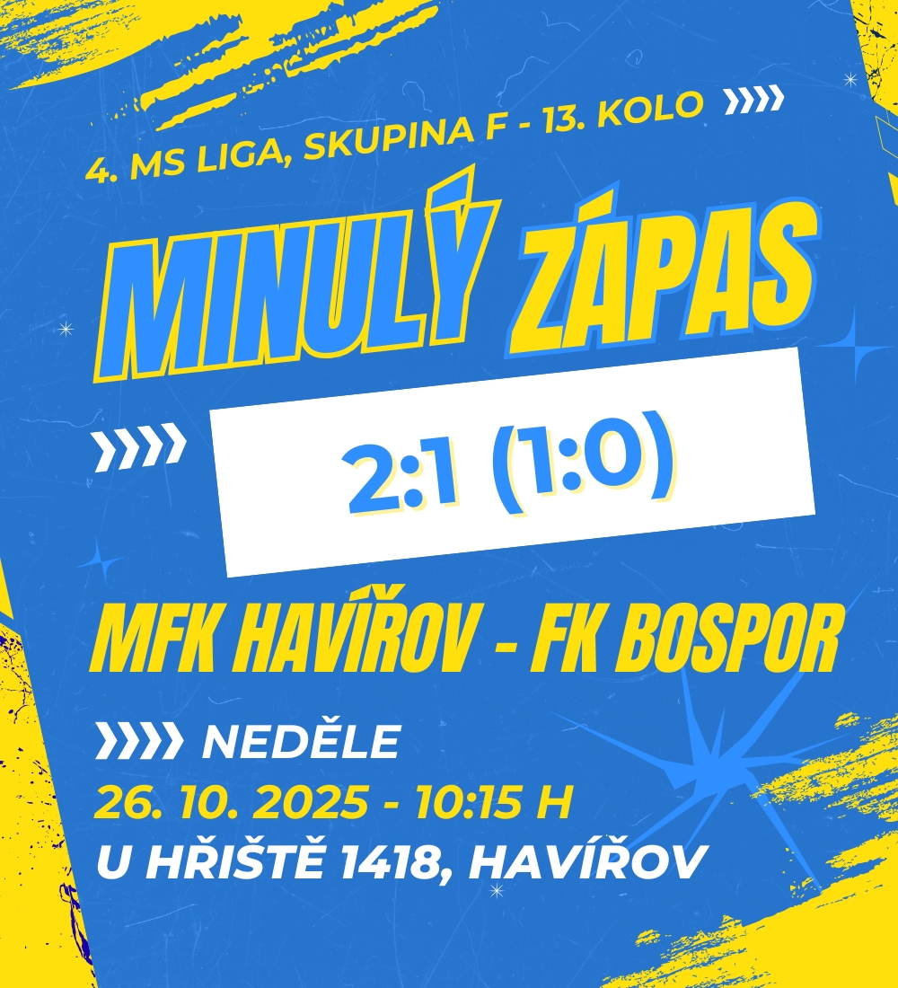 Přestože Bospor nebyl v duelu 13. kola 4. Moravskoslezské ligy skupiny F v Havířově na hřišti lídra tabulky rozhodně horším týmem, tak nakonec se nedočkal byť ani jediného bodu. Bohumíňáci totiž zahodili spoustu vyložených šancí, dvakrát inkasovali a nakonec stačili už jenom korigovat skóre Dominikem Palejem. Ze čtvrtého místa ztrácejí na vedoucí tandem čtyři body.