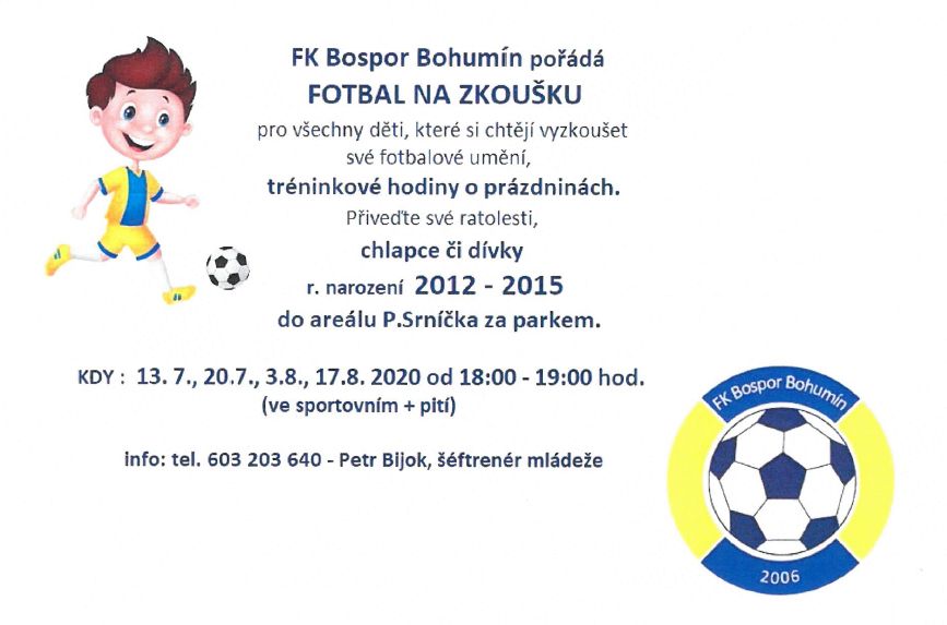 Projekt „Fotbal na zkoušku“ hodlá letos o prázdninách otestovat FK Bospor ve svých mládežnických kategoriích. Ve čtyřech termínech nabízí zcela zdarma chlapcům a děvčatům ročníků narození 2012-2015 účast na tréninku v rámci klubu. Vždy se bude jednat o šedesátiminutovou jednotku od 18 do 19 hodin. Přijít může kdokoliv!