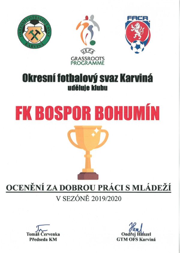 Součástí utkání v Karviné bylo i předání Ocenění za dobrou práci s mládeží pro FK Bospor Bohumín. „Velký dík patří všem členům vedení a hlavně trenérům, kteří svůj volný čas věnují právě našim mladým fotbalistům a fotbalistkám. Snažíme se to dělat, jak nejlépe umíme, všem velká poklona,“ dodal šéftrenér mládeže Petr Bijok.