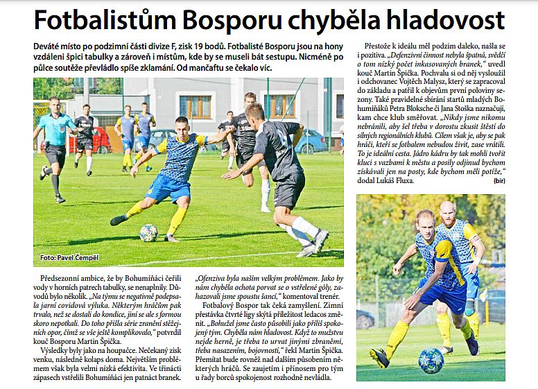 Předsezónní ambice, že by Bohumíňáci čeřili vody v horních patrech tabulky, se nenaplnily. Důvodů bylo několik. „Čekali jsme, v jakém stavu bude tým po jarním výpadku zápasů kvůli covidu, a musím uznat, že se to na nás podepsalo negativně,“ potvrdil kouč Bosporu Martin Špička. Některým hráčům chvíli trvalo, než se dostali do odpovídající kondice, jiní se ale s formou skoro nepotkali. „Do toho přišla ještě série zranění stěžejních opor, čímž se všechno ještě komplikovalo,“ dodal trenér.