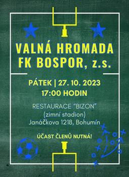 Předseda FK Bospor Bohumín, zapsaný spolek, svolává v pátek 27. října 2023 v 17:00 hodin řádnou Valnou hromadu - volební, která se koná v restauraci Bizon na zimním stadionu (Janáčkova 1218, Bohumín). Účast všech členů zapsaného spolku FK Bospor je nutná!